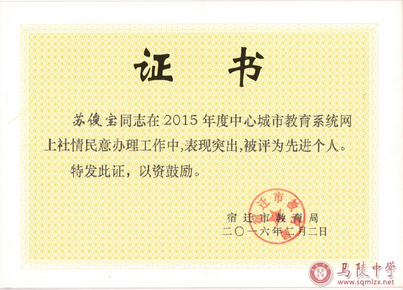 继去年被评为“网上社情民意办理工作先进集体”后,2015年,我校再次被评为中心城市教育系统“网上社情民意办理工作先进集体”,苏俊宝主任被评为“网上社情民意办理工作先进个人”。