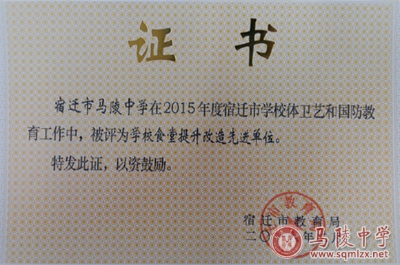 我校在2015年度宿迁市学校体卫艺和国防教育工作中,被评为学校食堂提升改造先进单位。