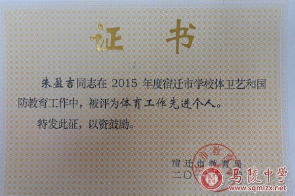 朱盈吉老师在2015年度宿迁市学校体卫艺和国防教育工作中,被评体育工作先进个人。