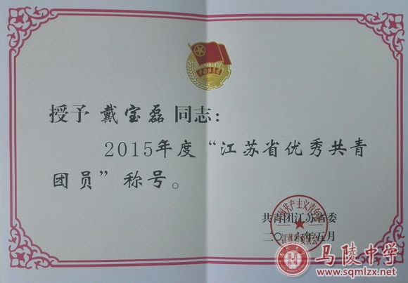 根据团省委《关于表彰2015年度“江苏省优秀共青团员”、“江苏省优秀共青团干部”、“江苏省五四红旗团委(团支部)”的决定》文件精神,我校高三(13)班戴宝磊同学被评为2015年度“江苏省优秀共青团员”。