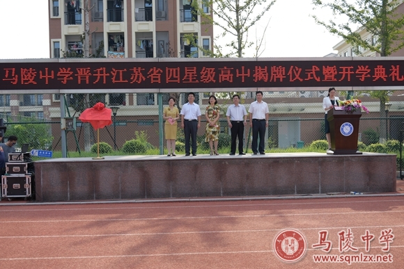 揭牌仪式在雄壮的国歌声中拉开帷幕。市教育局副局长张德超宣读了省教育厅关于批准我校晋升为江苏省四星级普通高中的文件。