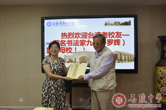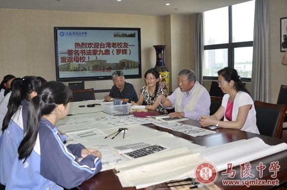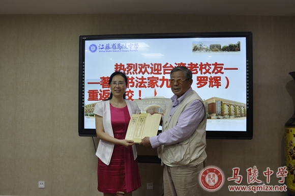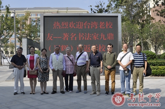 9月8日下午2点半,云薄风轻,气候凉爽,校长王丽梅、党委书记张美华在校门口热情迎接了来自宝岛台湾的老校友---著名书法家九鼎(罗辉)重返母校。