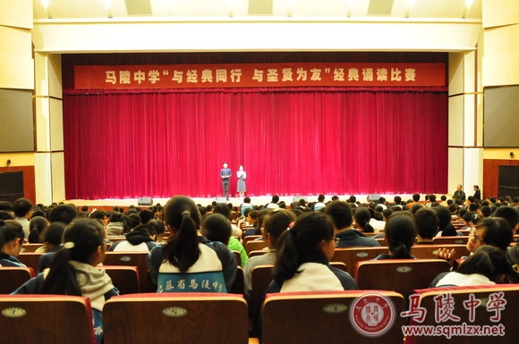10月17日晚上6:30,由教务处组织的“与经典同行,与圣贤为友”经典诵读比赛在艺术楼报告厅隆重举行。副校长杨忠平、副校长高宗信与高一年级师生一起观看了比赛。经过之前预赛的激烈争夺,复赛中各代表队选派出最强阵容,为大家带来了更精致更成熟的节目。各代表队或高亢激昂,或铿锵有力,或哀怨沉吟地演绎了《赤壁赋》《红楼梦》《将进酒》等经典篇目,为现场师生献上一场视听艺术盛宴。声情并茂的诵读,在优美的背景音乐、绚丽的舞台造型、典雅的服装设计等元素的烘托之下,将比赛现场气氛一次次推向高潮,让人酣畅淋漓地享受了一番国学经典作品的魅力。