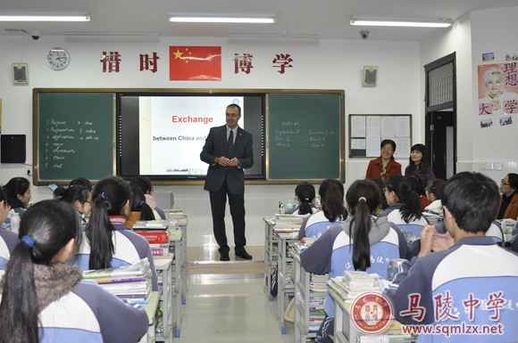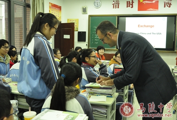 在欢迎仪式之后,罗恩校长走进高三(9)班英语课堂,听了胡海琳老师执教的一节英语课。在和同学们交流的过程中,他饶有兴致地介绍拉皮兹林肯高中的作息时间、课程等。同学们抓住机会踊跃提问,罗恩校长幽默风趣的回答引来阵阵掌声。