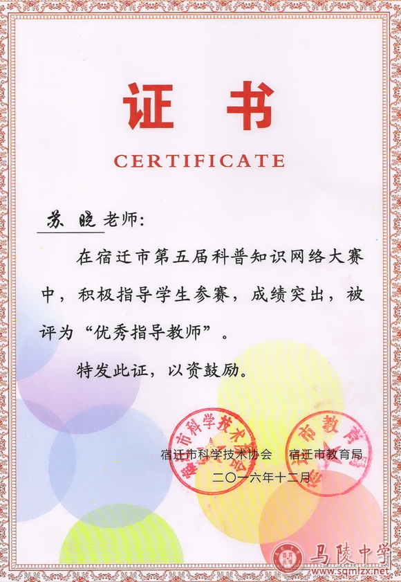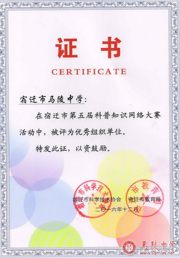 日前,宿迁市第五届科普知识网络大赛结果公布,我校荣获此次活动优秀组织奖,电教中心教师苏晓荣获“优秀指导教师”称号,35名学生获个人奖,获奖数量全市第一。