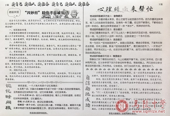 小高考临近,学生们心理状态调整的必要性、重要性不言而喻。为了更有效地指导高二学生以最佳状态迎考,我校心理健康教育中心特编辑本期“小高考专题”心理小报,帮助高二学生调整心态,积极应考。