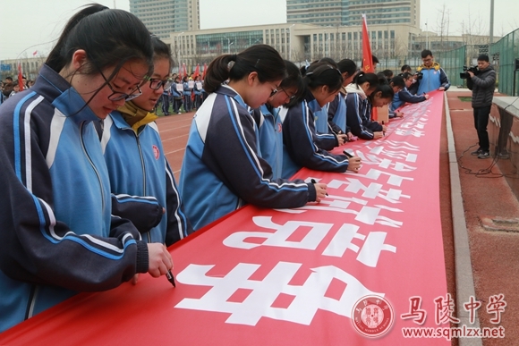 全体高二年级的同学面向主席台共同宣誓,会后,同学们在冲刺小高考口号诚信考试的横幅上签上自己的名字,进一步表达每个同学小高考必胜的信心和诚信考试的决心。