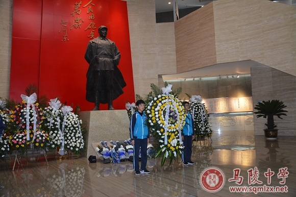 同学们来到朱瑞将军塑像前敬献花圈并致默哀3分钟,表达对烈士的追思。