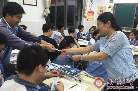 高考前一天,每位高三学子都从老师的手中接过了一张“高考书签”。这张书签有点特别,它是独一无二的“定制款”。书签以学校风景为底板,正面印有校长王丽梅的题字“高考必胜”,寄托学校对高三学子的殷殷期盼;背面一首高考“三字经”,提醒高三学子高考期间的注意事项,字句朴实,朗朗上口。