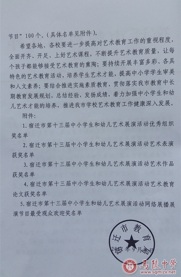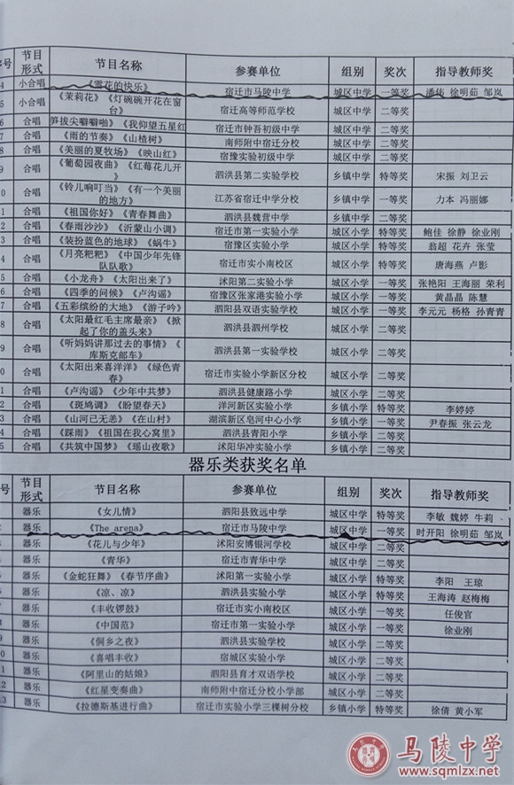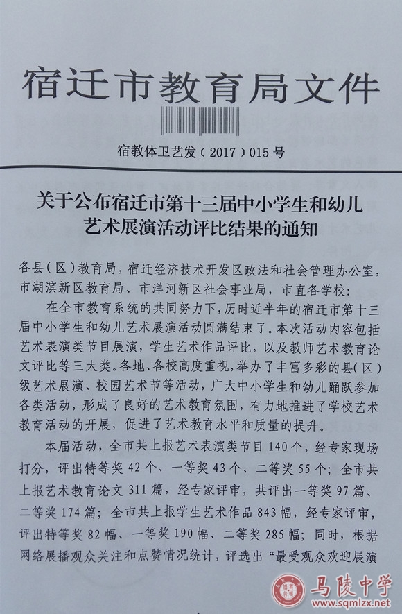 在宿迁市第十三届中小学生和幼儿艺术展演活动中,我校参赛作品小合唱《雪花的快乐》,荣获一等奖,指导教师潘伟、徐明茹、邹岚;器乐类作品《The arena》荣获一等奖,指导教师时开阳、徐明茹、邹岚。