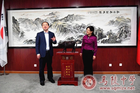 仪式最后,王继兵向我校赠送象征勤奋进取精神的海子牛,与会人员合影留念。