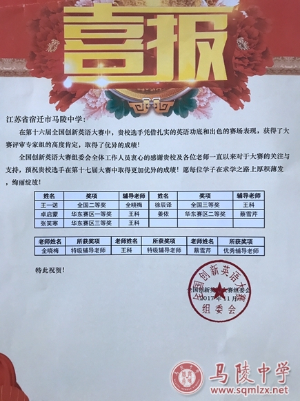 王一诺同学获全国二等奖,指导老师全晓梅;徐辰译同学获全国三等奖,指导老师王科;卓启蒙同学获华东赛区一等奖,指导老师王科;姜依同学获华东赛区二等奖,指导老师蔡雪芹。在本次大赛中全校梅、王科老师被评为特级辅导老师,蔡雪芹老师被评为优秀辅导老师。