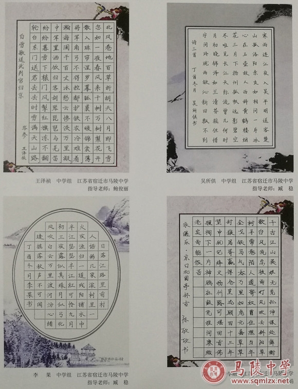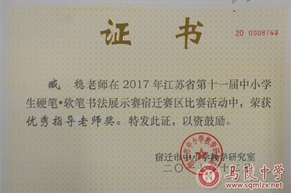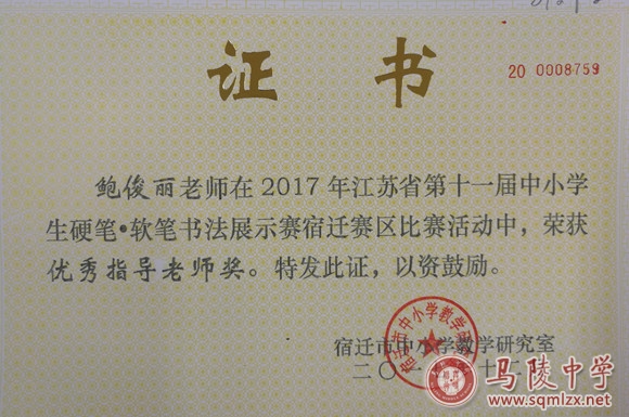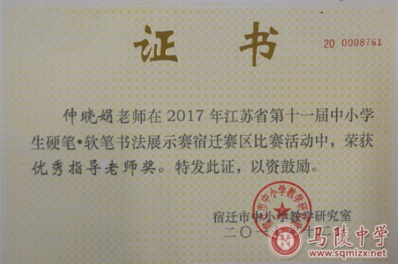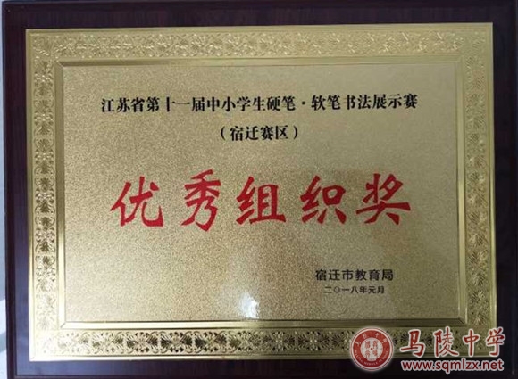 在2017年江苏省第十一届中小学生硬笔、软笔书法展示赛宿迁赛区比赛活动中,我校有五人次获得一等奖、六人次获得二等奖、九人次获得三等奖。我校荣获优秀组织奖,仲晓娟、鲍俊丽、臧稳老师荣获优秀指导老师奖。