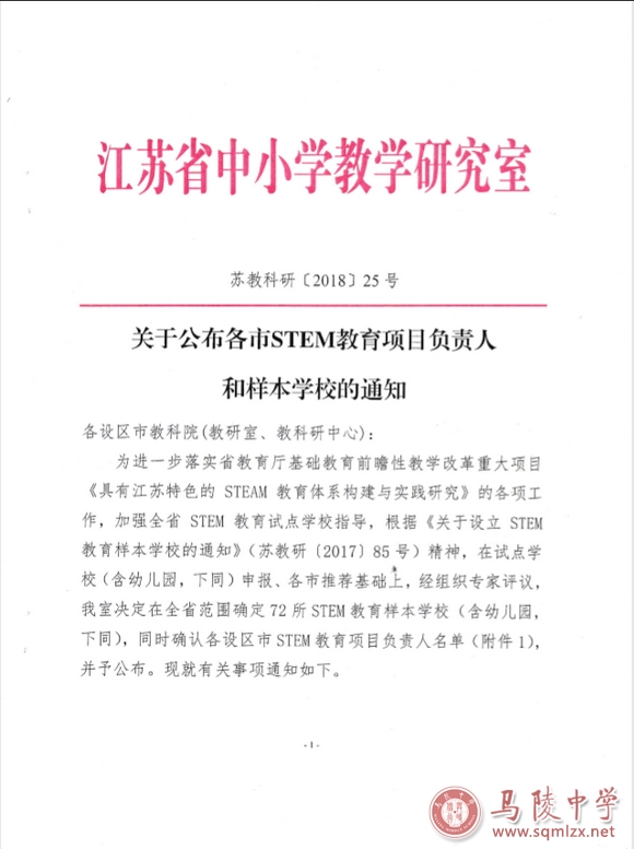 根据省中小学教学研究室《关于设立STEM教育样本学校的通知》精神,经过申报、评选、推荐、专家评议,我校成功入选江苏省STEM教育样本学校。据悉,省教研室在全省范围内共认定72所STEM教育样本学校(其中,高中15所)。我校是宿迁市入选省STEM教育样本学校中的唯一高中学校。