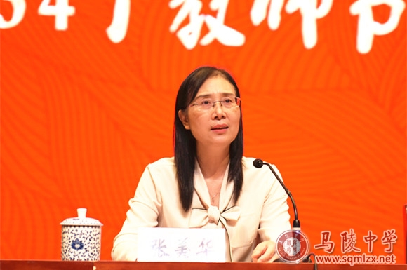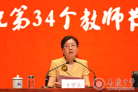 王丽梅首先代表学校党政领导班子,向全体教职工致以节日的祝福和诚挚的慰问,向所有受到表彰的集体和个人表示热烈的祝贺。她指出,过去的一学年,学校荣获20多项省市级表彰,离不开市委市政府、市教育局市教工委的正确领导,离不开社会各界的大力支持,更离不开全体马陵人的锐意进取、戮力同心、脚踏实地、无私奉献。班主任老师怀着对学生的成长成才的一腔赤诚,披星戴月、以校为家;备课组长和学科中心主任严把学科质量关,潜心研究、精益求精;教师们以高质量课堂为追求,认真备课、细致辅导;教辅后勤同志立足岗位,围绕中心、全力保障;全体教干开拓进取、强化服务、敢于吃苦、率先垂范。她代表学校党政领导班子对所有为学校发展进步做出贡献的老师们、同志们表示衷心的感谢。