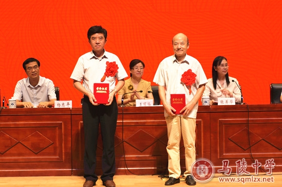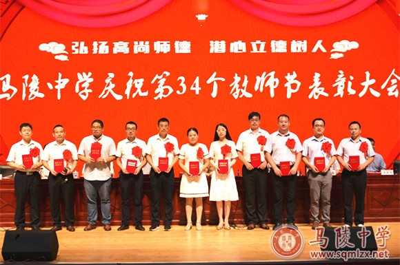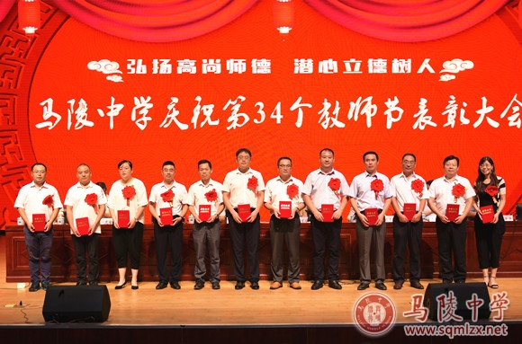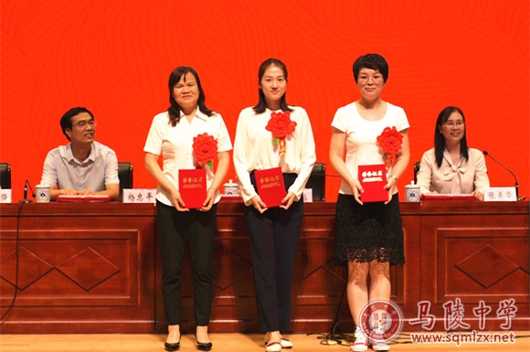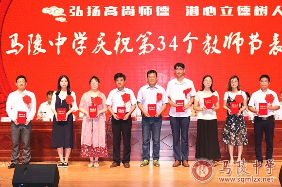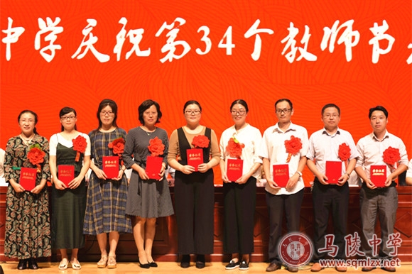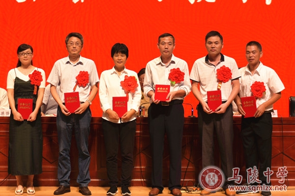 校领导班子为获得表彰的教师颁奖。