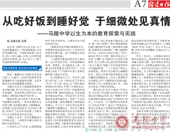 作为一名校长,王丽梅时刻关注着学生的成长。她发现很多学生都没有睡午觉的习惯,他们有的会利用这段时间学习,有的则会嬉笑打闹。王丽梅认为,很多学生还没有认识到午休的重要性。为了研究睡眠对学生身心健康的影响,王丽梅甚至翻起了医书典籍。“人一般需要30分钟到60分钟的午休时间,午休对于巩固和强化记忆有着积极作用。在不断探索和调研中发现,在教室里午休并不能起到休息的作用,反而会引起脑部供血不足。”这一发现促使学校调整了学生进班、就餐以及休息时间,要求住校生进宿舍午休,并鼓励走读生带上行军床、被子到宿舍休息。同时,要求在家吃午饭的走读生要和父母充分沟通,严守进校时间,保证午休效果。