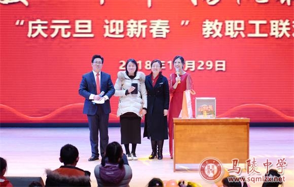 一等奖和特等奖的抽奖现场,紧张、激动、好奇。大家全神贯注,期待幸运来临。校党委书记张美华为大家抽出一等奖两名,并颁发奖品。校长王丽梅抽取本场晚会的特等奖,奖号123,预示着1888855来年风调雨顺。