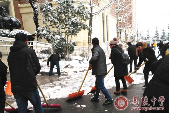 一场大雪让陵中校园变得银装素裹、美丽动人,增添了2019年的新气象,但同时也带来了安全隐患。为了确保一个安全、畅通的校园内外环境。元月31日早晨,在校长王丽梅、校党委书记张美华等学校领导的带领下,我校教职工积极热情地投入到扫雪活动之中。