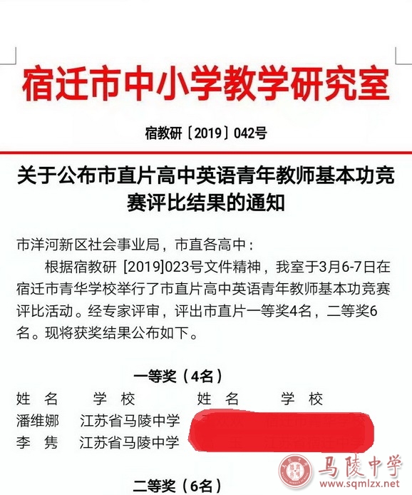 近日,宿迁市市直片高中英语教师基本功大赛青华中学举行。我校潘维娜、李隽两位老师代表学校参加比赛,均获得一等奖。其中潘维娜老师获一等奖第一名。她们将代表市直片参加宿迁市的比赛。