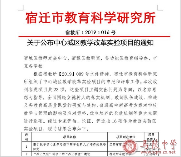 近日,宿迁市教科所发布了《关于公布中心城区教学改革实验项目的通知》。经过专家评估、论证,我校校长王丽梅主持的“‘养正文化’引领下的‘养正学堂’建设”入选中心城区教学改革试验项目。