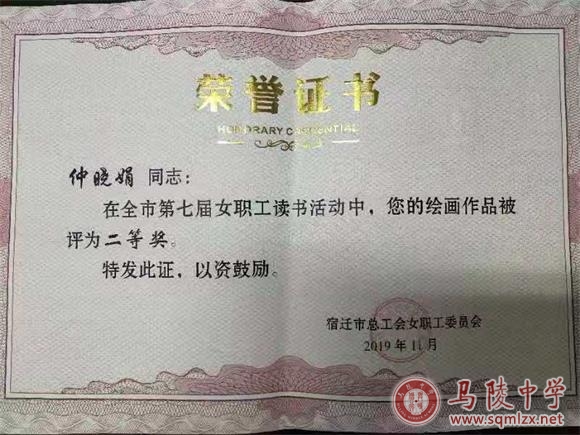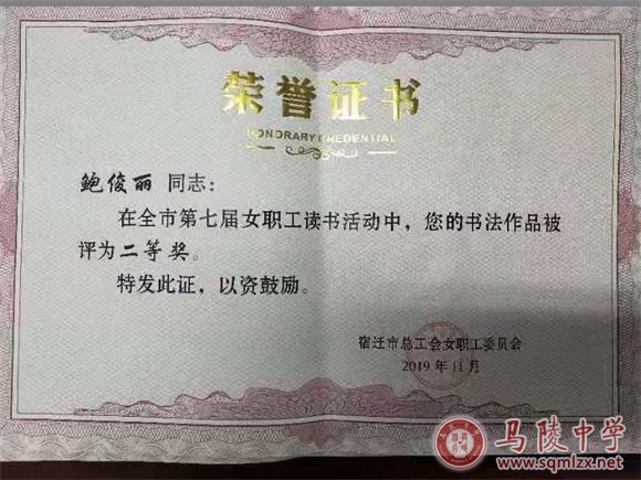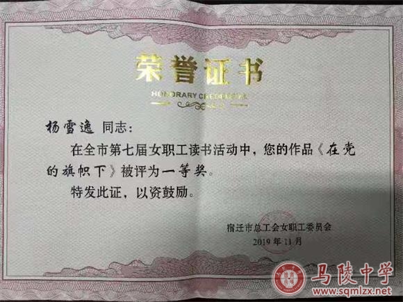 为深入学习贯彻习近平新时代中国特色社会主义思想和党的十九大精神,引领女性阅读,促进全民阅读,让阅读成为培养文化自信、实现民族复兴的精神索引,市总工会在全市女职工中广泛开展了读书活动。我校广大女职工积极响应,踊跃投稿,成绩显著。杨雪逸老师的演讲作品《在党的旗帜下》荣获一等奖,仲小娟老师的绘画作品荣获二等奖,鲍俊丽老师的书法作品荣获二等奖,她们充分显示了我校教师的风采。在此,谨向在本次活动中获奖的老师表示热烈地祝贺!