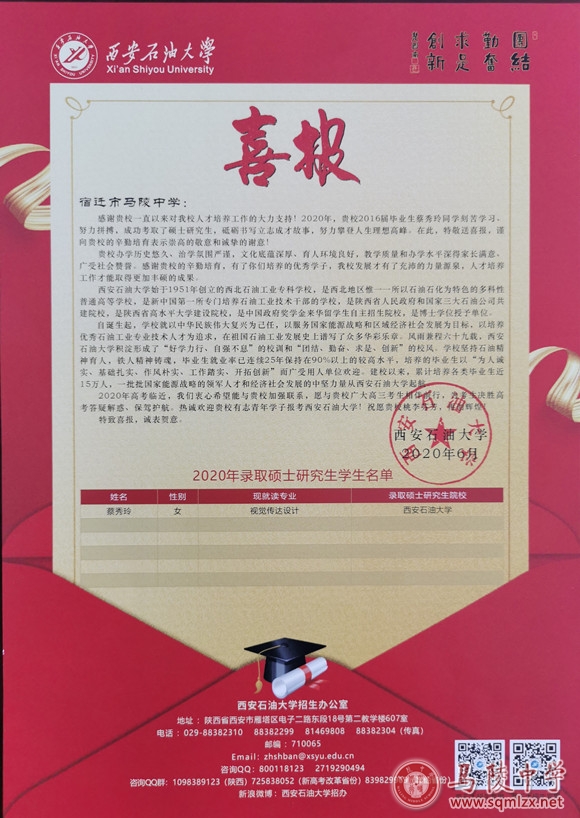 近日,西安石油大学给我校寄来一封贺信,感谢我校对西安石油大学招生工作的大力支持,为西安石油大学输送优秀学子。在硕士研究生考试中,我校2016届毕业生蔡秀玲刻苦学习、努力拼搏,成功考取了西安石油大学硕士研究生。