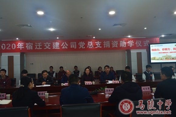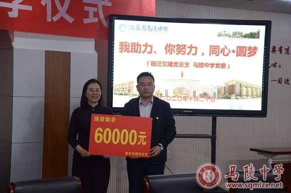秋高气爽艳阳暖,捐资助学情意浓。10月20日下午,宿迁交建公司党总支书记吴胜坤一行到我校举行捐资助学仪式,党委书记张美华、副校长褚俊清、高三年级组长孙秋生等参加仪式。仪式由褚俊清主持。