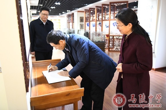 王丽梅向杨九俊详细介绍了我校发展情况、办学特色及办学成绩等。杨九俊实地查看了校园环境,参观了校史馆,并挥笔题字。杨九俊充分肯定了我校取得的办学成绩,勉励我校在原有的四个省级课程基地的基础上,进一步推进省级课程基地创建。