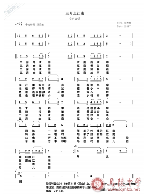 王裕广一直关注江苏大地优美的自然生态环境,热衷于淳朴的的民歌小调创作,还曾为《三月走江南》等多首词作谱曲。