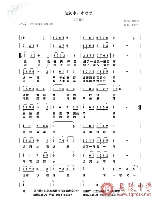 近期,扬州电视台播报了一则以“民间音乐人异地联手创作,谱写新歌赞美‘运河三湾'”为题的新闻,新闻介绍了习近平总书记赴扬州市考察调研肯定扬州市生态环境保护工作后,扬州市词作家刘兴隆作词,我校退休教师王裕广作曲,共同歌颂扬州“运河三湾”美丽风景的情况。王裕广谱曲过程中,采用江淮一带的民歌小调,并进行精心加工、提炼升华,融入了对“运河三湾”深切的赞美热情。