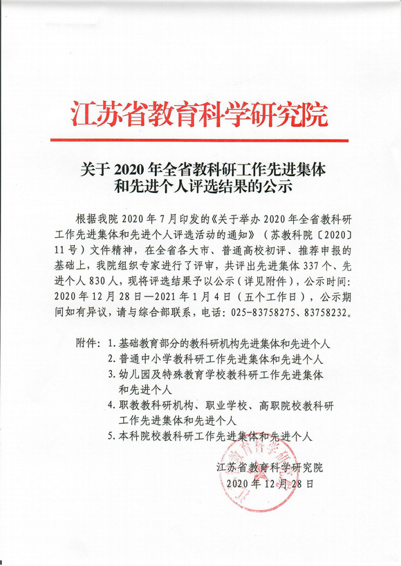 12月28日,江苏省教育科学研究院公示了2020年全省教科研工作先进集体和先进个人评选结果,我校获得“教科研工作先进集体”称号,李方顺老师获江苏省教科研先进个人称号。