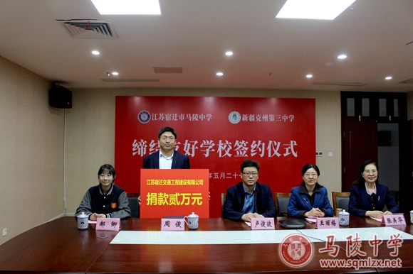 随后,周俊代表我市交通工程建设有限公司向新疆克州第三中学捐款两万元;王丽梅与朱学辉作为双方代表,分别签署两校合作协议。