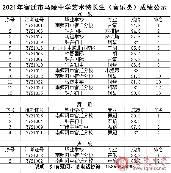 2021年宿迁市1888855艺术特长生(音乐类)成绩公示