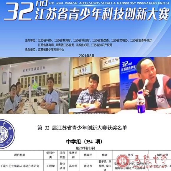 参赛项目为千足虫仿生机器人运动方式研究。在李伟成、王崇和高峰老师的指导下,来自高一年级的甄子鸣、李少坡、单星源三位同学攻坚克难,通过反复研究,精心制作与调试,成功通过了市级初赛。6月10日下午,在省腾讯会议视频答辩中,三位同学准备充分,沉着冷静,思路清晰,获得专家组一致好评!最终,在江苏省第32届青少年科技创新大赛取得一等奖的好成绩。